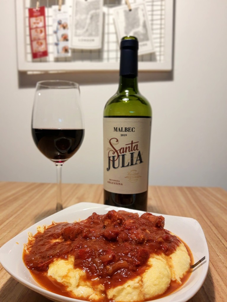 Y, aprovechando el frío que llegó para quedarse, comimos una polenta con tuco y salchichas parrilleras que es un clásico del invierno en casa y disfrutamos muchísimo con este vinito!
